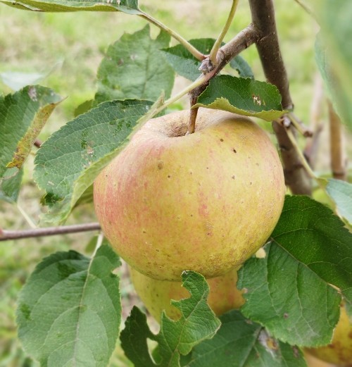 La date de floraison coïncide avec mon reine des reinettes, soit mi-avril. Le scion est jeune mais vigoureux et rustique (pas vu de tavelure, pas attaqué par le carpo alors que d'autres de mes pommiers en sont farcis). Les pommes sont grosses (entre 7 et 9 cm de diamètre et 200 à 300g). J'ai du les cueillir car le vent a commencé à les faire tomber mais je pense qu'elles ne sont pas tout à fait mûres. A la dégustation la pomme est juteuse, sucrée et acidulée, la peau relativement fine et un peu rugueuse. La chair est crème assez ferme et dense.